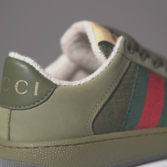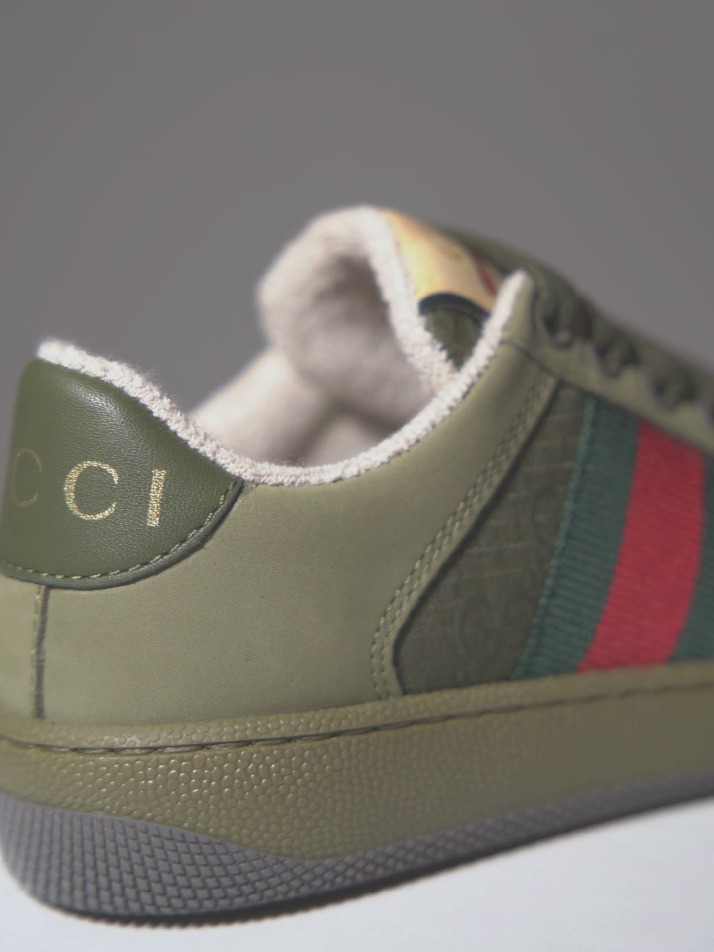 Colore: Verde Descrizione: Sneakers Screener verdi del luxury brand Gucci Kids, in pelle con inserti in cotone ripstop GG verde, suola in gomma bicolore, chiusura con lacci, dettaglio ovale smaltato con GG in metallo sulla parte anteriore e logo sul retro. Ispirate alle classiche sneaker degli anni '70, le Screener presentano il nastro Web, rosso e verde, laterale e l'etichetta con il logo Gucci vintage. Made in Italy Dettagli: 50% Pelle, 50% Tessile.