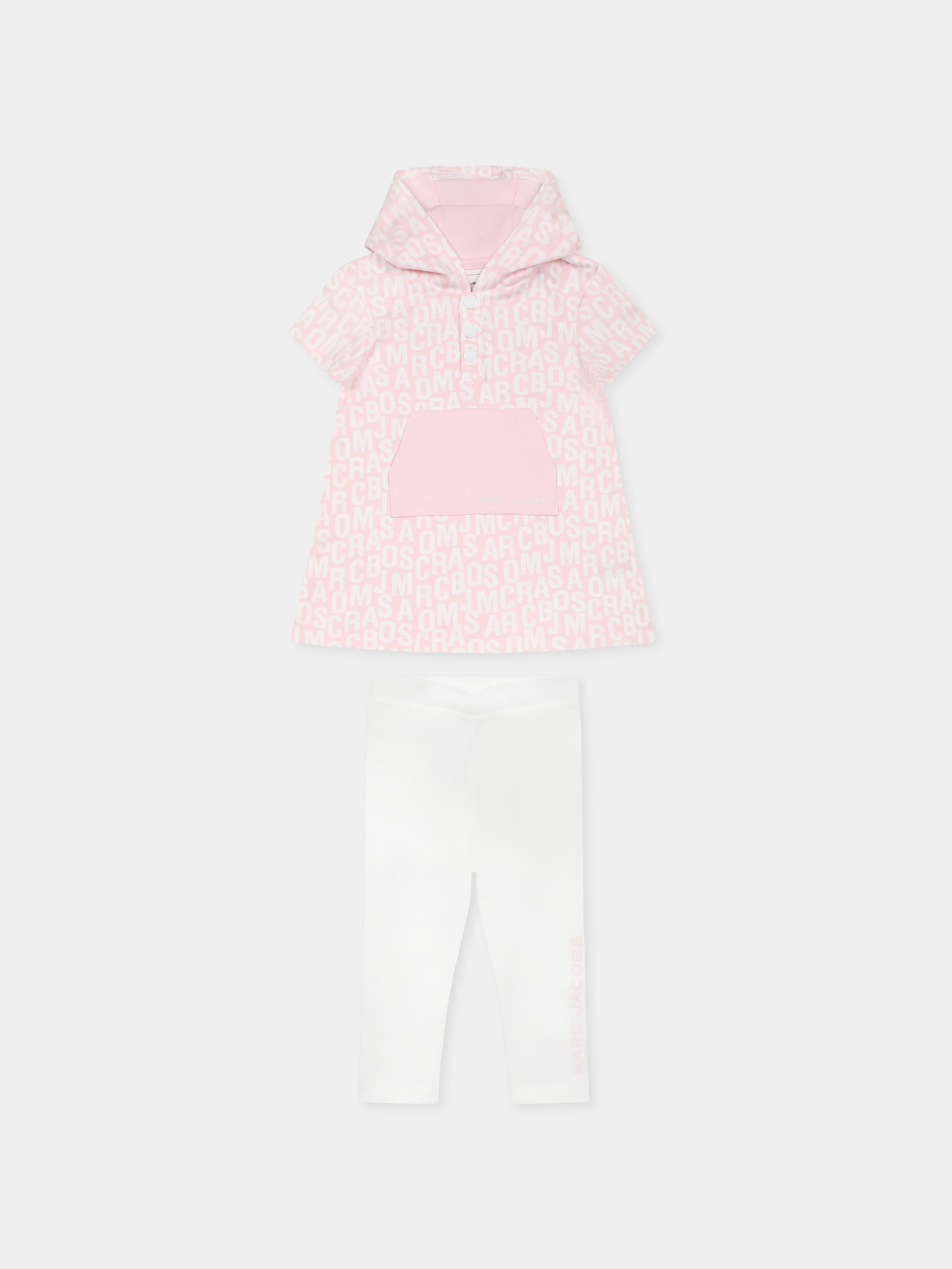 Colore: Rosa Descrizione: Completo rosa in cotone, composto da vestito e leggings. Vestito a maniche corte, con cappuccio, bottoni automatici e tasca sul davanti; decorato con logo a contrasto all-over. Leggings bianchi con vita elasticizzata; decorati con logo rosa su una gamba. Dettagli: 100% Cotone. Lavare a 30°C.