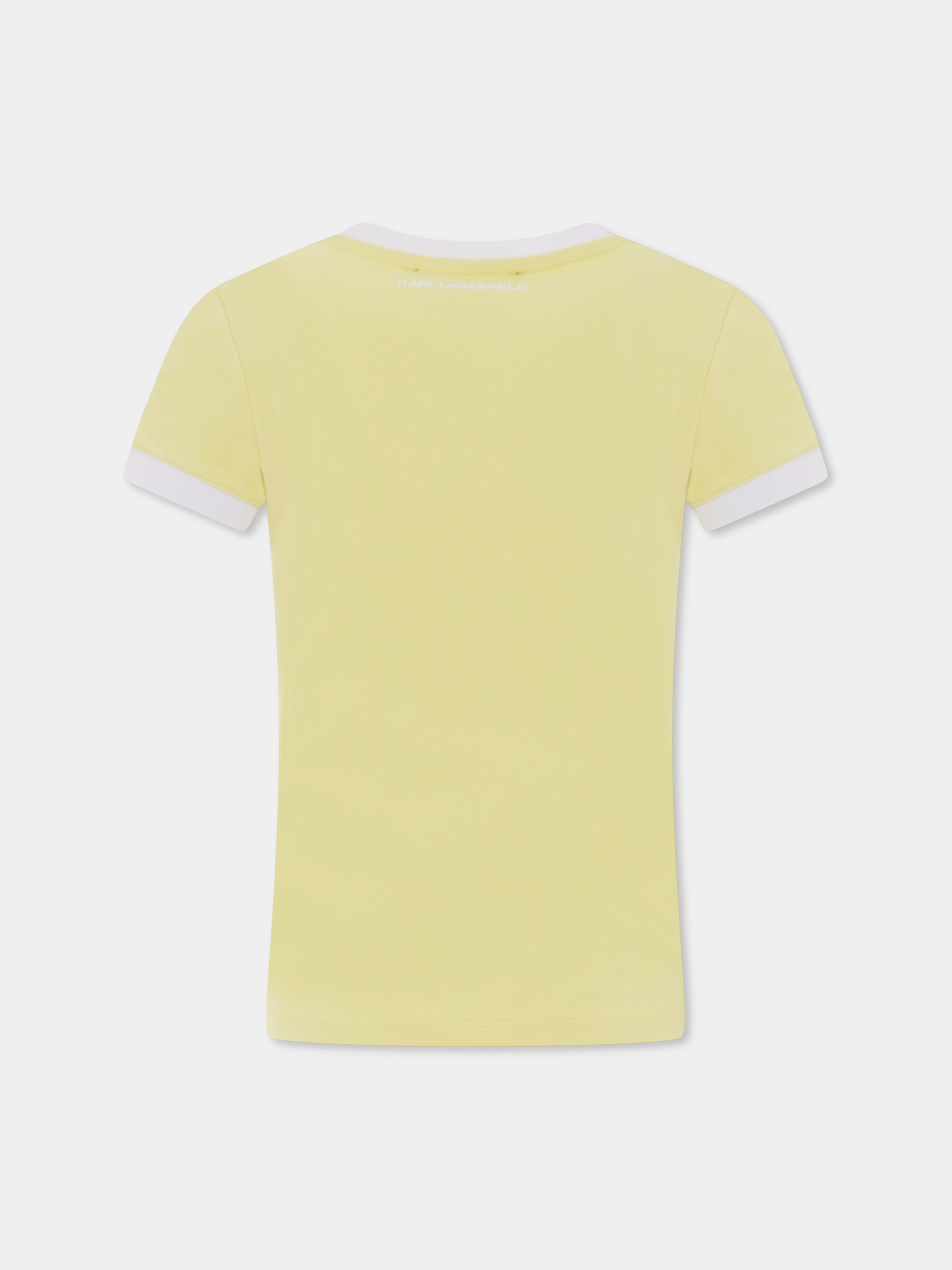 Colore: Giallo Descrizione: T-shirt gialla in misto cotone, con maniche corte, girocollo a costine e profili bianchi. È decorata con stampa Karl Lagerfeld e logo sulla parte anteriore e con logo sul retro. Dettagli: 97% Cotone, 3% Elastan. Lavare a 30°C.