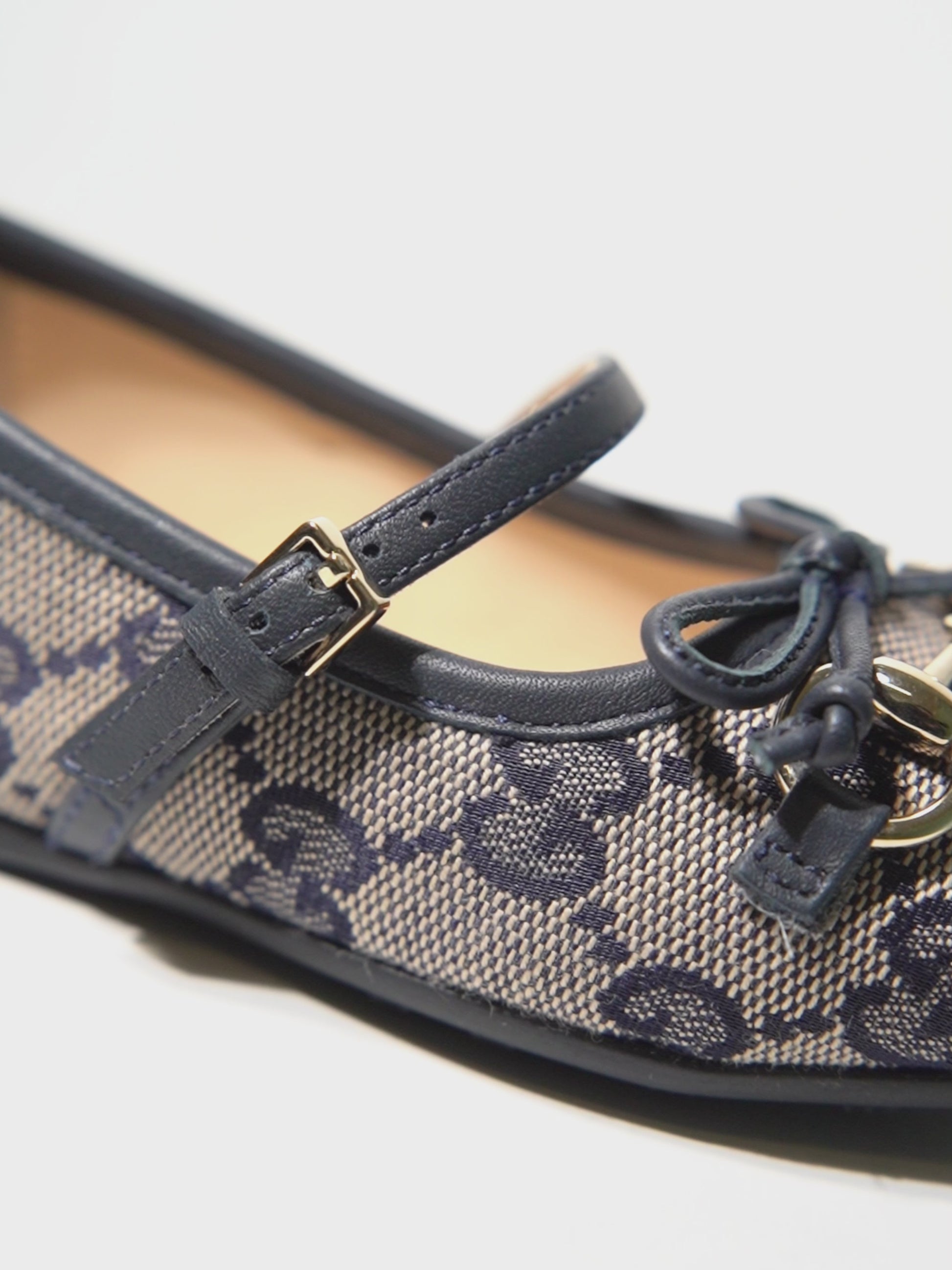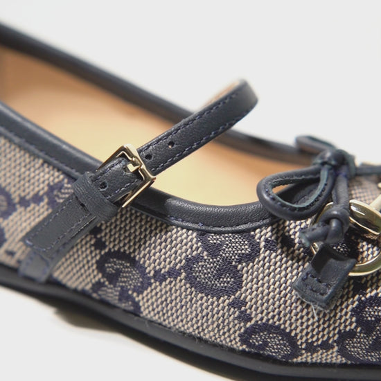 Ballerine beige in canvas GG Supreme Gucci Kids con profilo e cinturino in pelle blu a contrasto. La tomaia presenta monogram GG all-over e punta leggermente squadrata che aggiorna il classico modello Mary Jane. Sul davanti, piccolo fiocco in pelle incornicia il morsetto Horsebit dorato che dialoga con la piccola fibbia laterale, mentre la fodera chiara e la suola sottile completano una linea essenziale e riconoscibile.