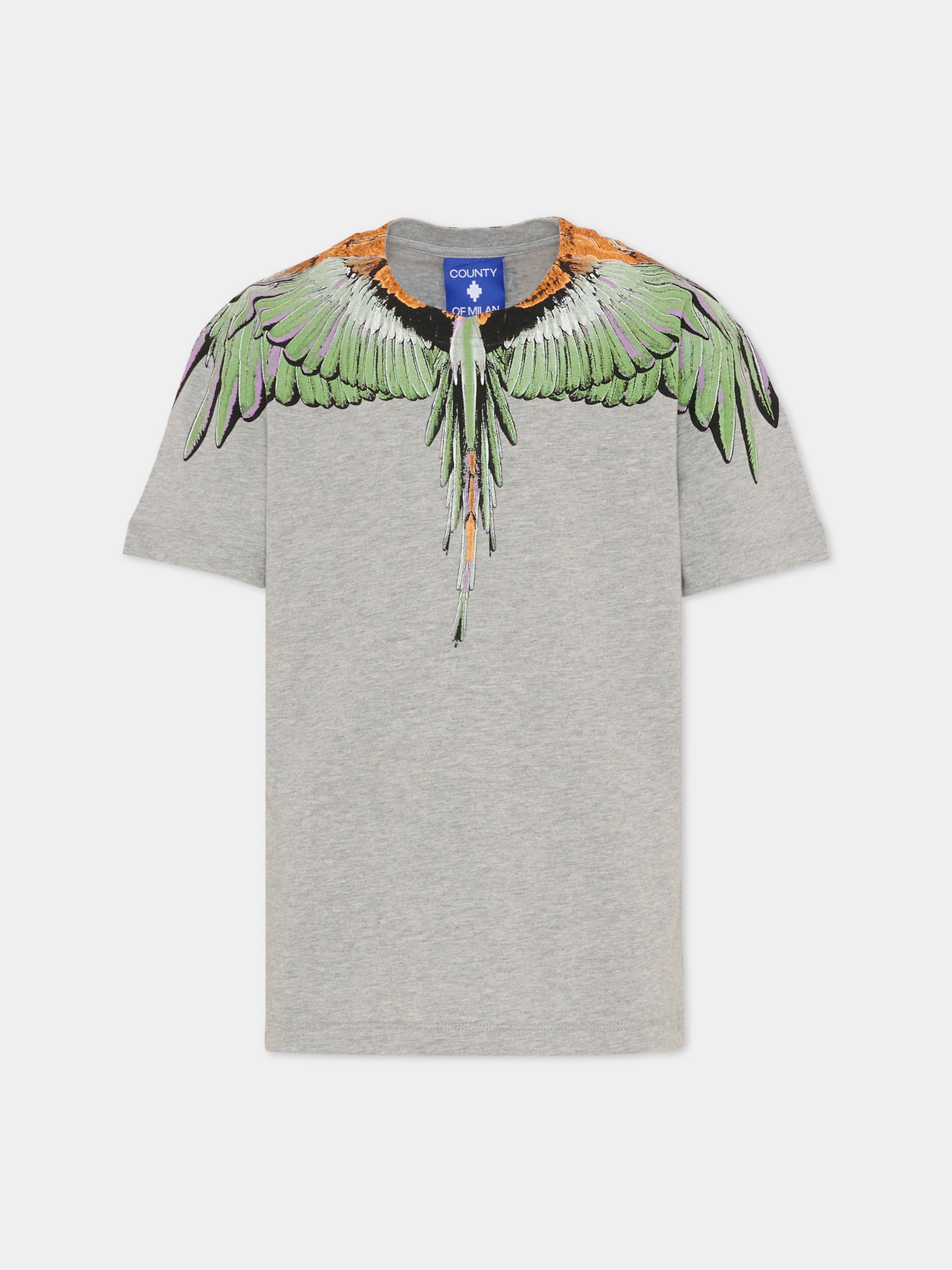 Colore: Grigio Descrizione: T-shirt grigio melange in cotone, con maniche corte e girocollo a costine. È decorata con iconiche ali multicolor sulle spalle. Dettagli: 100% Cotone. Lavare a mano.
