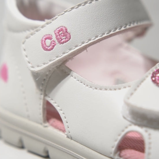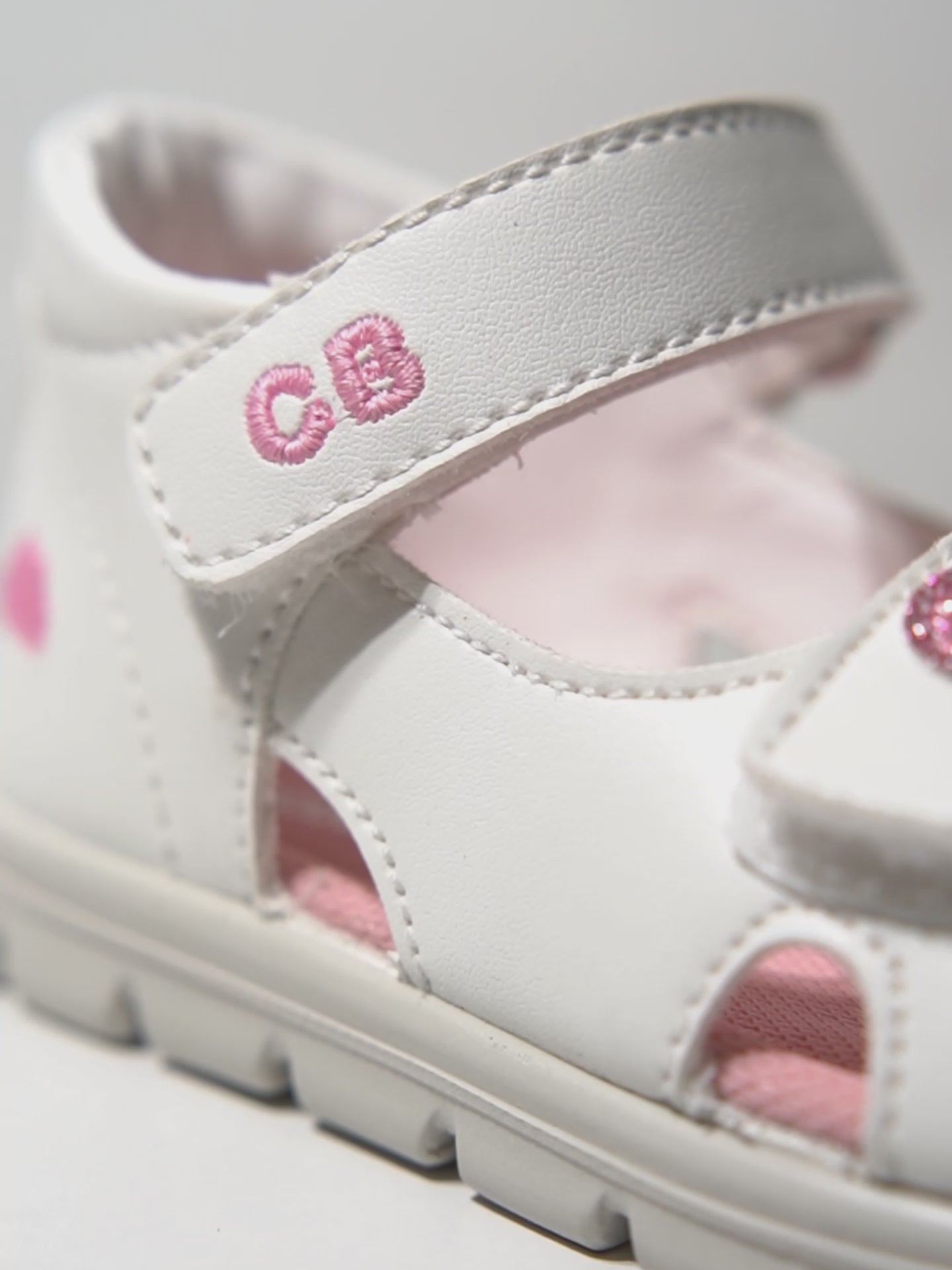 Sandali bianchi Little Cirrus firmati Falcotto x CoccoleBimbi in materiale no-leather dalla linea primi passi. Tomaia essenziale con punta aperta e cinturino frontale decorato da nuvole glitter rosa, richiamo all’iconico universo CoccoleBimbi. Chiusura a velcro alla caviglia con logo ricamato per una calzata regolabile e stabile. Plantare morbido rosa coordinato e suola flessibile in gomma con battistrada scanalato completano un profilo leggero e confortevole.