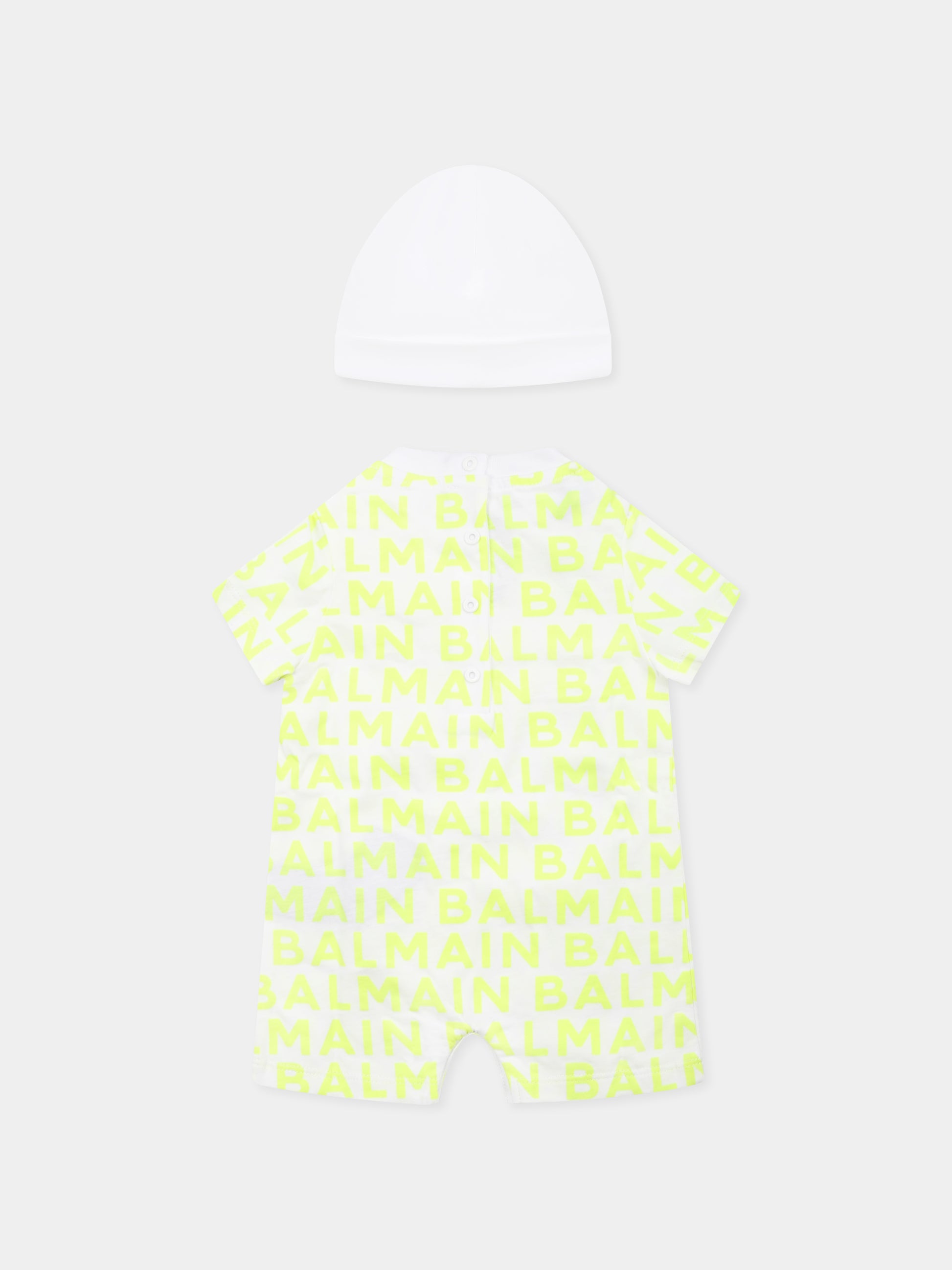 Colore: Giallo Descrizione: Pagliaccetto giallo in cotone organico, con cappello coordinato. Pagliaccetto a maniche corte, girocollo a costine, chiusura con bottoni automatici sul retro e tra le gambe. È decorato con logo giallo fluo all-over e patch frontale logata. Cappello con risvolto, decorato con logo frontale. Dettagli: 100% Cotone organico. Lavare a 30°C.