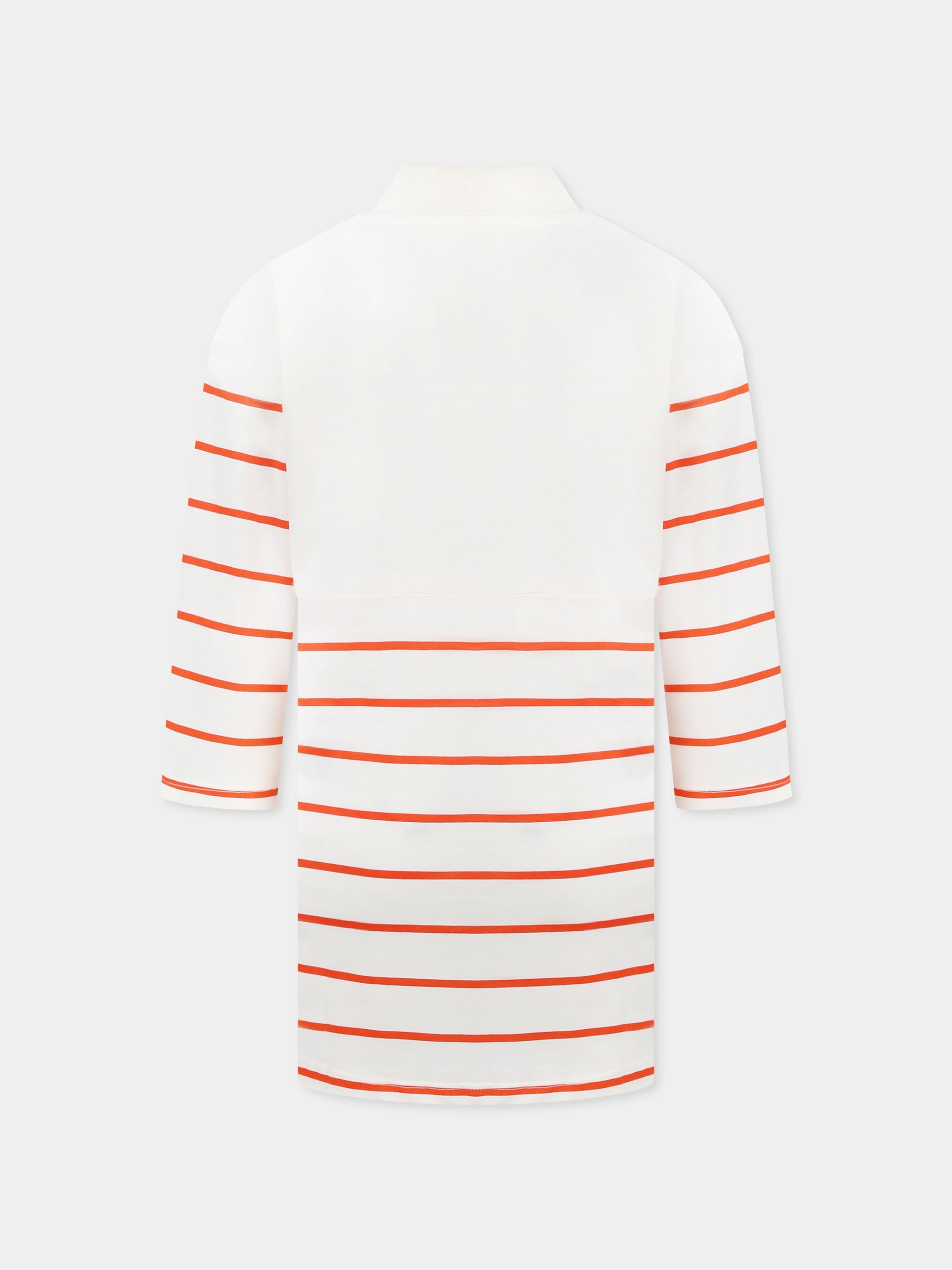 Colore: Avorio Descrizione: Vestito avorio in cotone organico, con righe rosse, maniche lunghe e collo alto a costine. È decorato con stampa sciarpa sulla parte anteriore e logo ricamato sul petto. Dettagli: 100% Cotone organico. Lavare a 40°C.