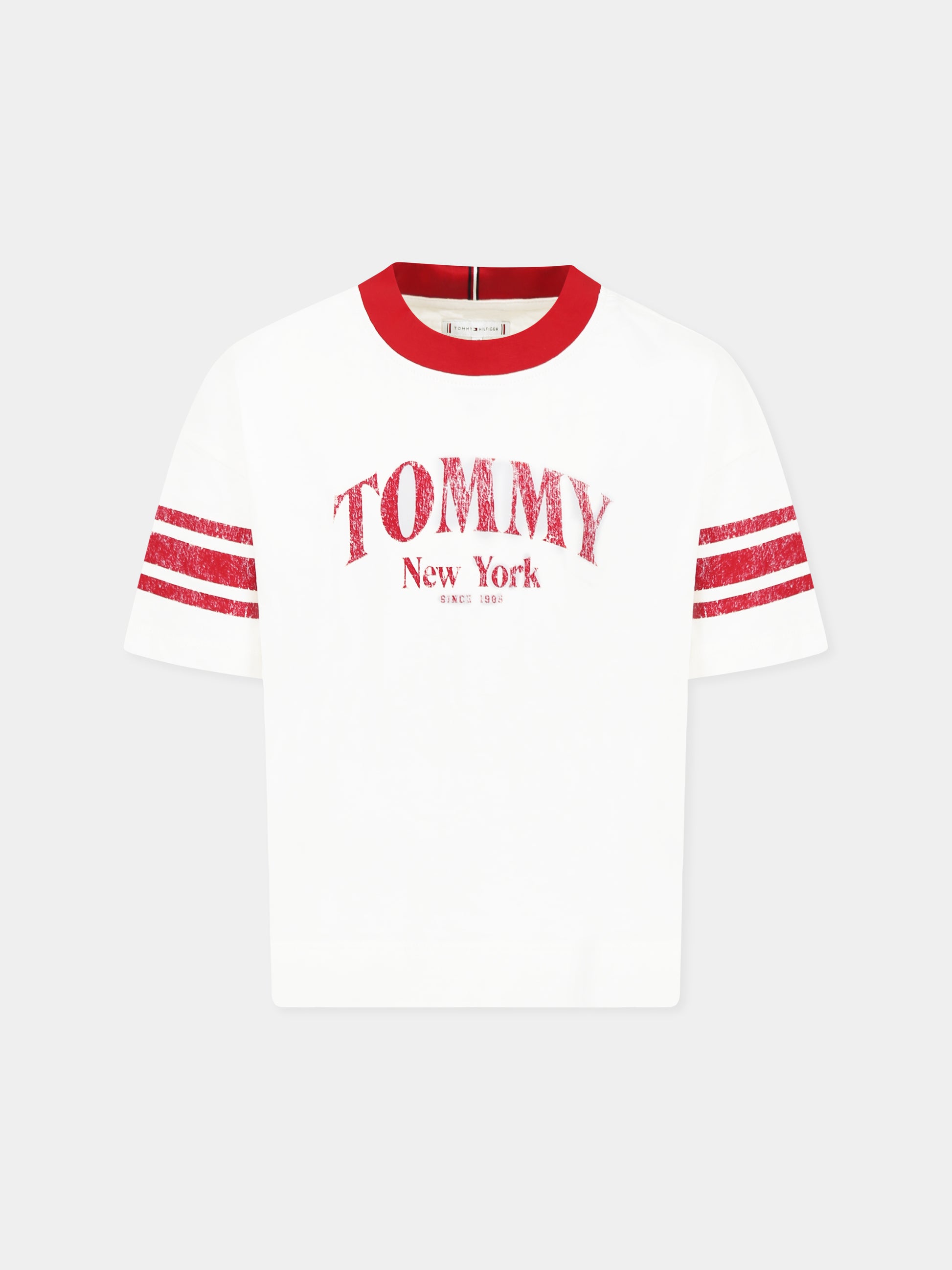 Colore: Avorio Descrizione: T.shirt avorio in misto cotone organico, con maniche corte, girocollo a coastine e dettagli a righe rosse effetto vintage sulle maniche. È decorata con logo vintage sulla parte anteriore e iconica bandierina ricamata. Dettagli: 100% Cotone. Lavare a 30°C.