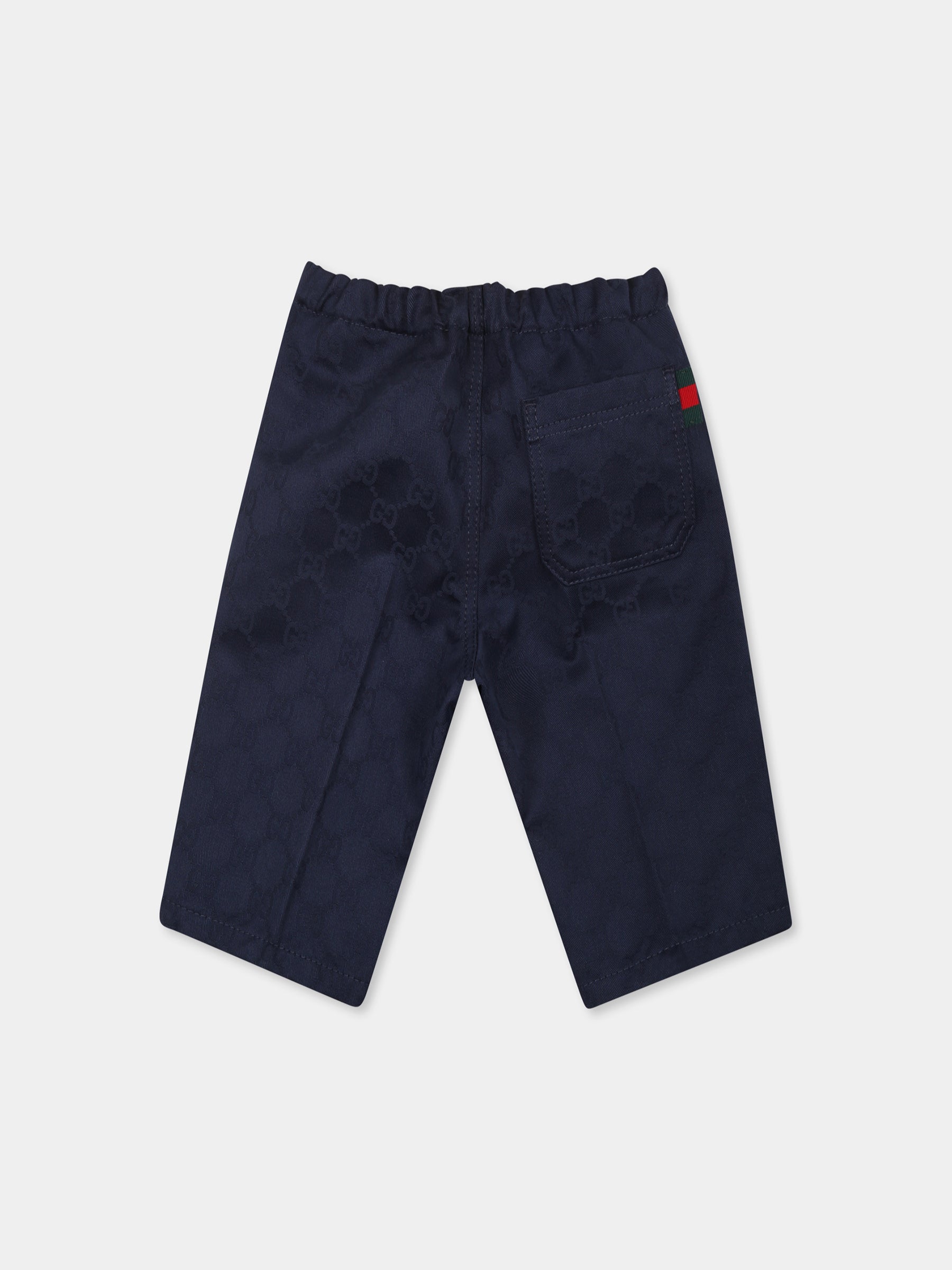 Colore: Blu Descrizione: Pantaloni blu del luxury brand italiano Gucci Kids, realizzati in gabardina di cotone GG, con elastico in vita, chiusura frontale con bottone e tasca applicata sul retro. Sono decorati con dttaglio Web rosso e verde sul retro. Made in Italy Dettagli: 100% Cotone. Lavare a secco.