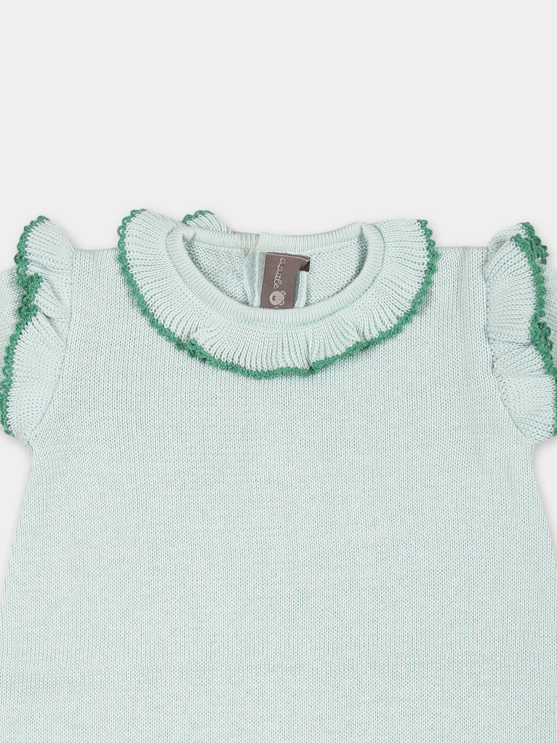 Colore: Verde Descrizione: Pagliaccetto verde in filo di cotone, a maniche corte, con girocollo, rouche intorno al collo, sulle spalle e sul fondo, chiusura con bottoni in madreperla sul retro e tra le gambe. Made in Italy Dettagli: 100% Cotone. Lavare a mano.