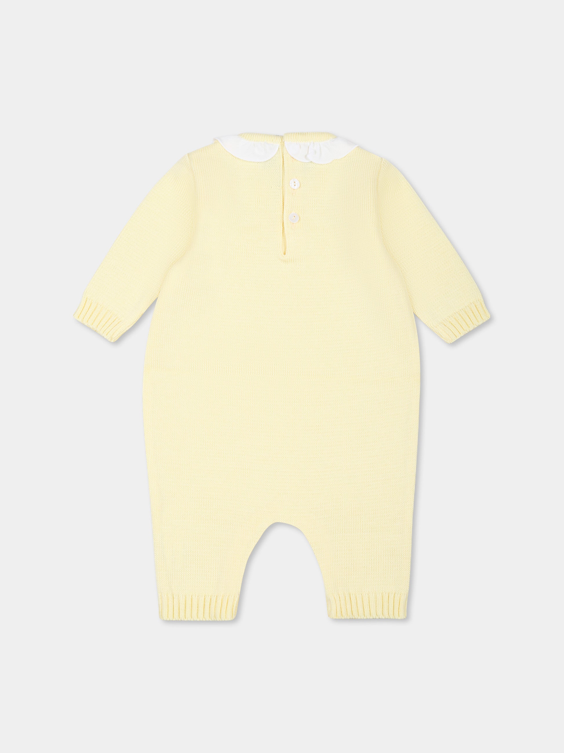 Colore: Giallo Descrizione: Tutina gialla in filo di cotone, a maniche lunghe, con girocollo con rouche bianca, bottoni in madreperla sul retro e tra le gambe, polsini e caviglie a costine. È decorata con pois ricamati sulla parte anteriore. Made in Italy Dettagli: 100% Cotone. Lavare a mano.