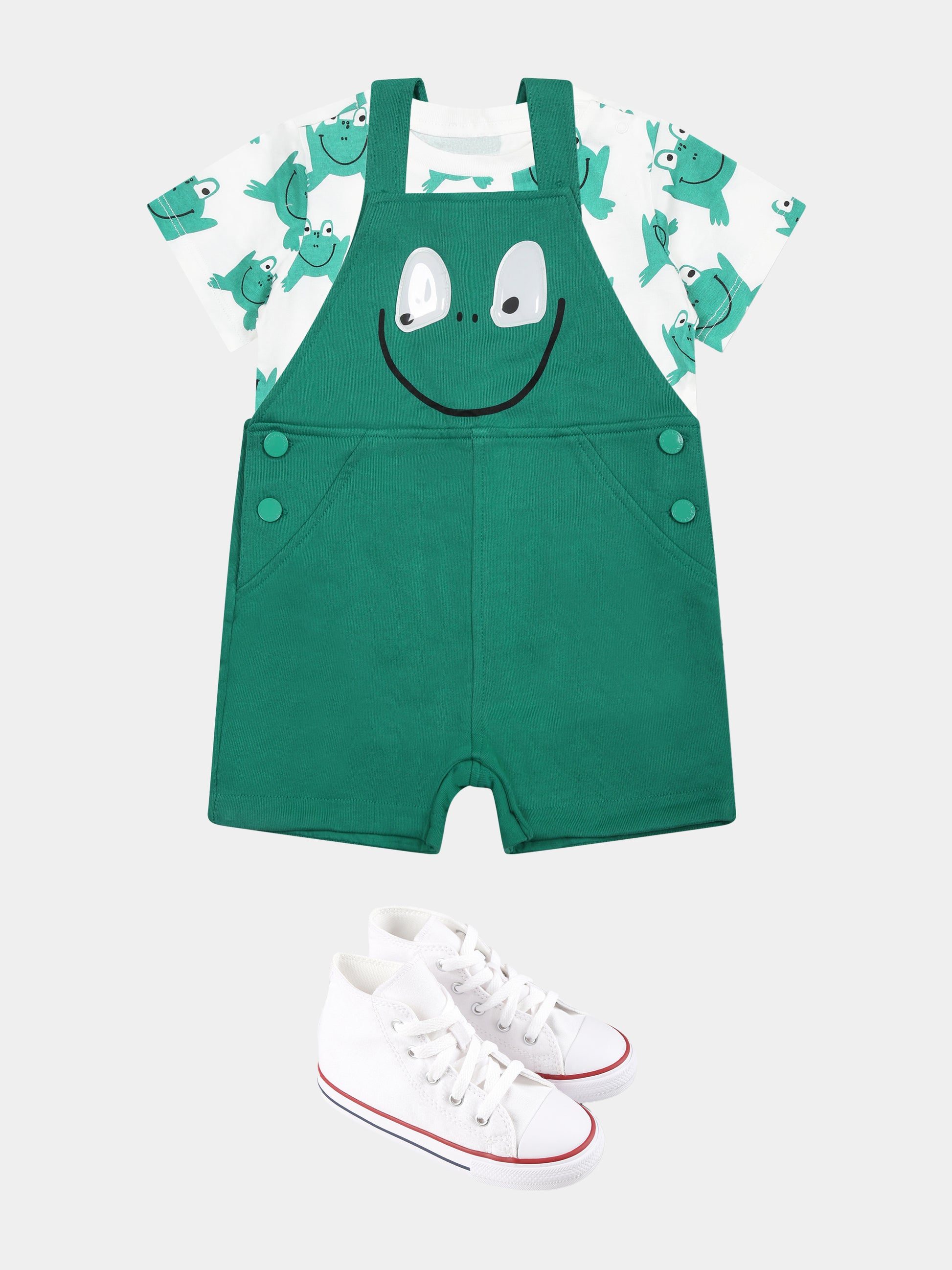 Colore: Bianca Descrizione: T-shirt bianca in cotone organico certificato GOTS, con maniche corte, girocollo a costine e chiusura con bottoni automatici sulla spalla. È decorata con stampa rana all-over. Dettagli: 100% Cotone organico. Lavare a 30°C.